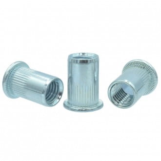 Nitonakrętka stalowa ocynkowana kołnierz płaski radełkowany, Materiał : stal ocynkowana, Rozmiar gwintu nitonakrętki : M5, Przeznaczona do materiału o grubości ścianki 2,5 - 5,0 mm, Blind rivet nut Flat Head Knurled Body